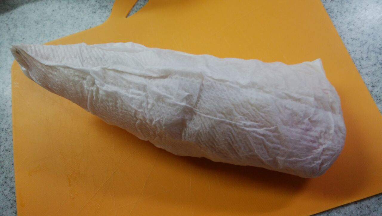 これに新たなキッチンペーパーをキッチリと巻き、その上からまたこれもキッチリと、ラップで包むのです。
