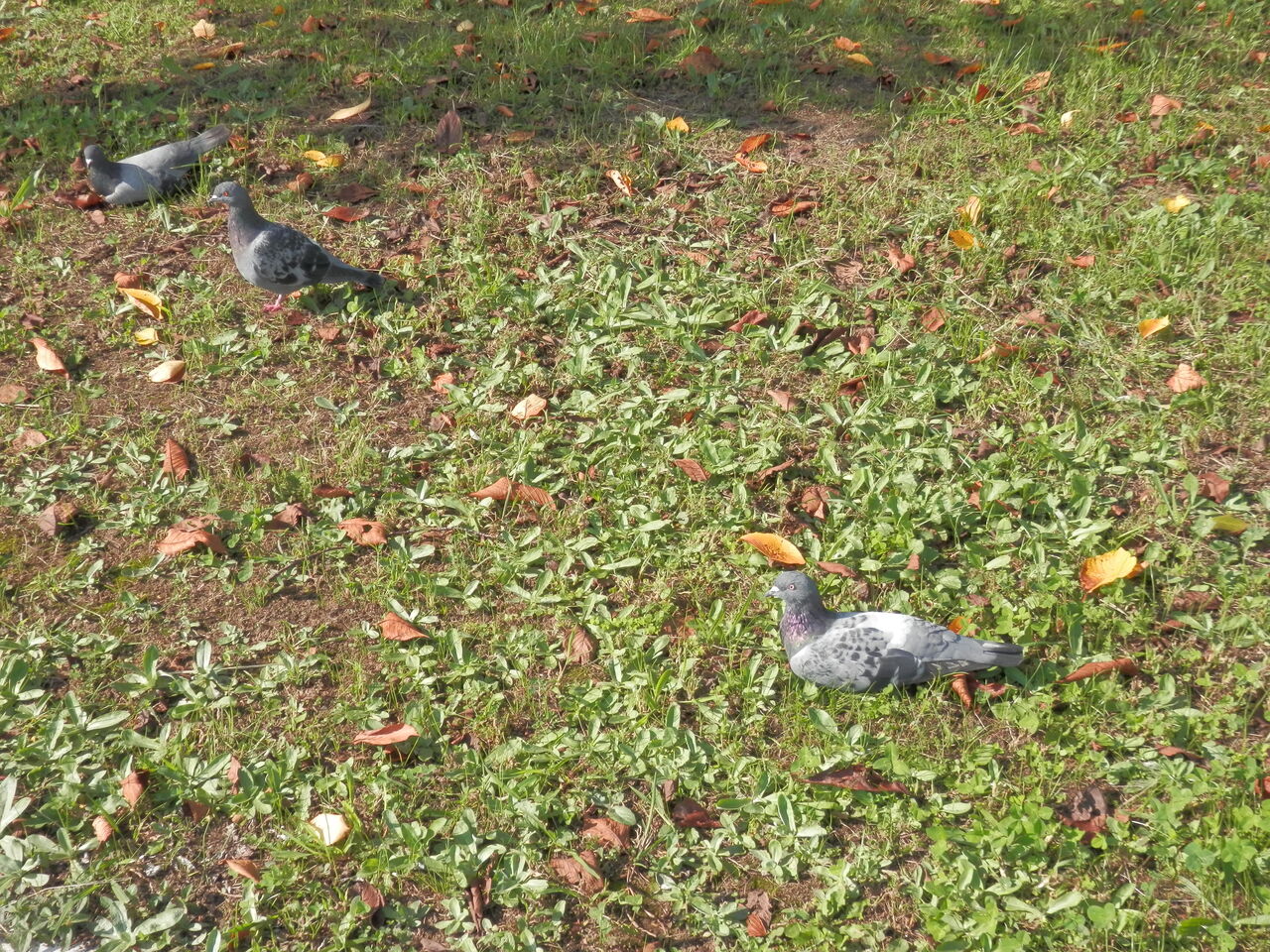 土手に到着、朝は肌寒いのか、ひだまりで鳩が地面にお腹をつけて暖を取っていました。