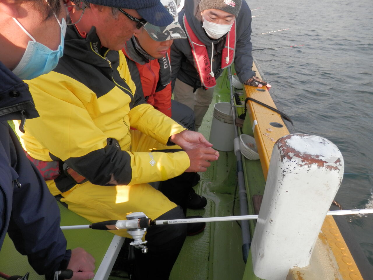 出船後は、魚との最初の接点となるエサ付けを個々にお伝えさせていただいております。