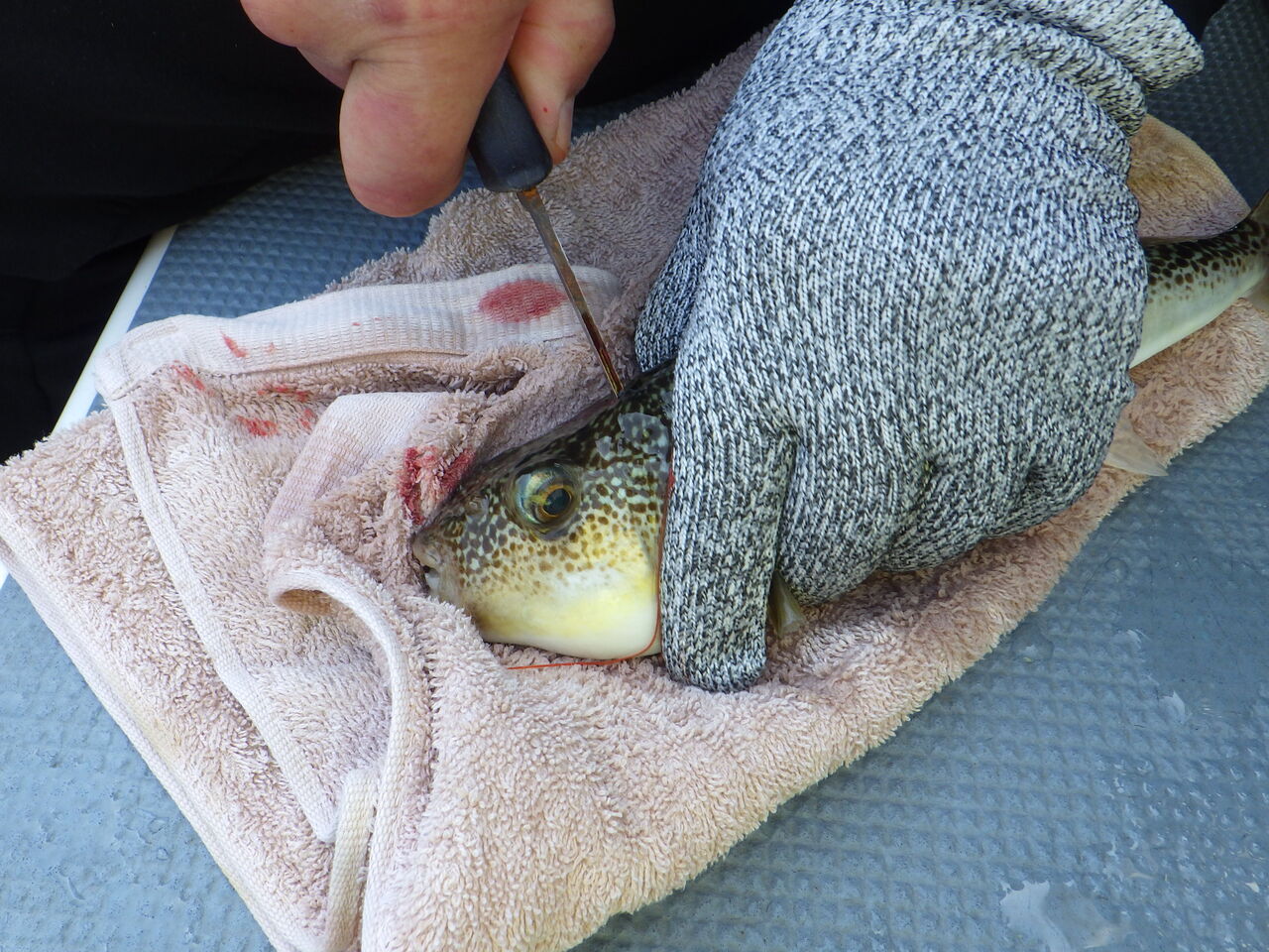 釣り上げたフグは暫くバケツで休ませた後、フグの頭のこの部分に包丁の切っ先を入れて中骨を断ちます。