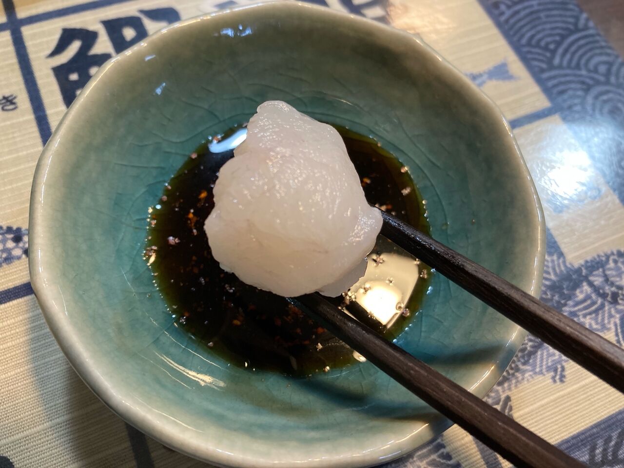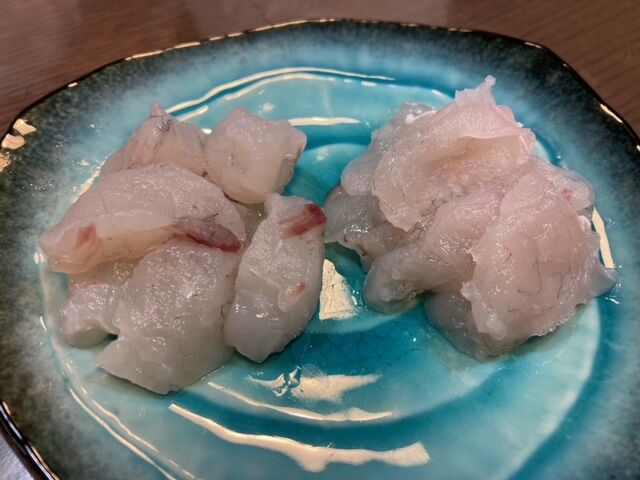 次に角切りですが、同様にあわ漬け醤油につけて口の中に、3噛み位からうま味が、5噛み、10噛みすると口の中一杯にうま味と甘みが広がり、鼻腔からは何とも言えないフグの風味を感じました。