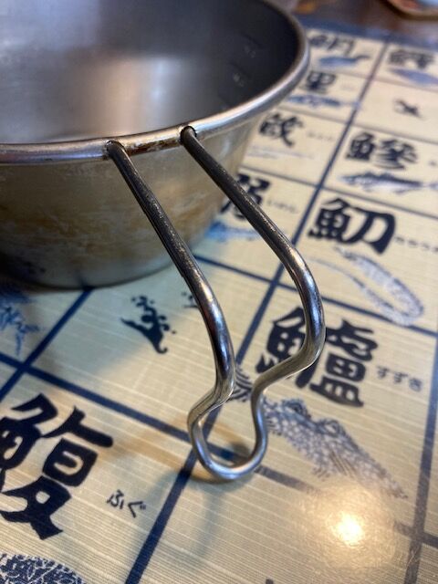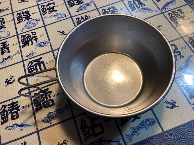 この器はアウトドア用の鍋で、シェラカップを大きくしたような形でオールステンレスで出来ています。