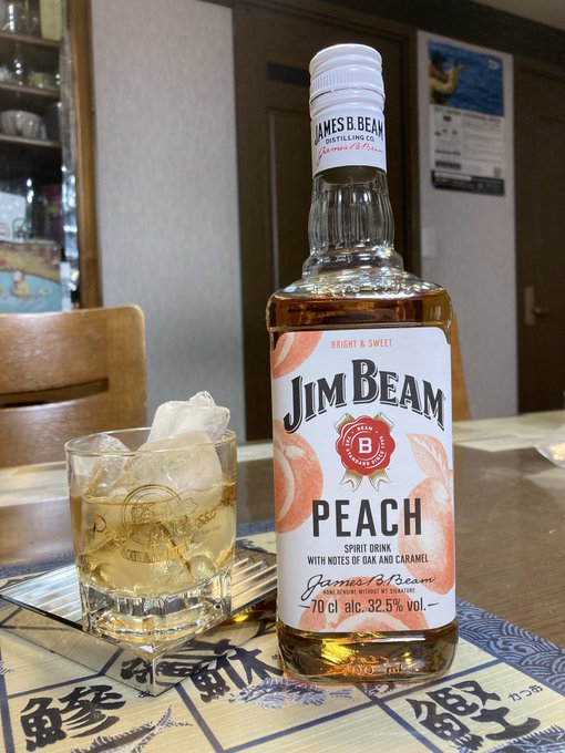 先日スーパーにお酒を買いに行くと、そのジンビームが並んでいるタナに「ピーチ」、「アップル」、「ハニー」などのフレーバーがあり、その中のピーチを手に取ったのでした(記載には「リキュール」とありました)。