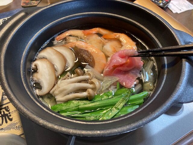 今回は薄切りの豚肉と殻ごとの海老を中心に白菜やきのこ類など、他には鱈や豆腐なども好みなのです(牡蠣もたいへん好みですが今年は高いですねぇ、なのでエビで・・・苦笑)。