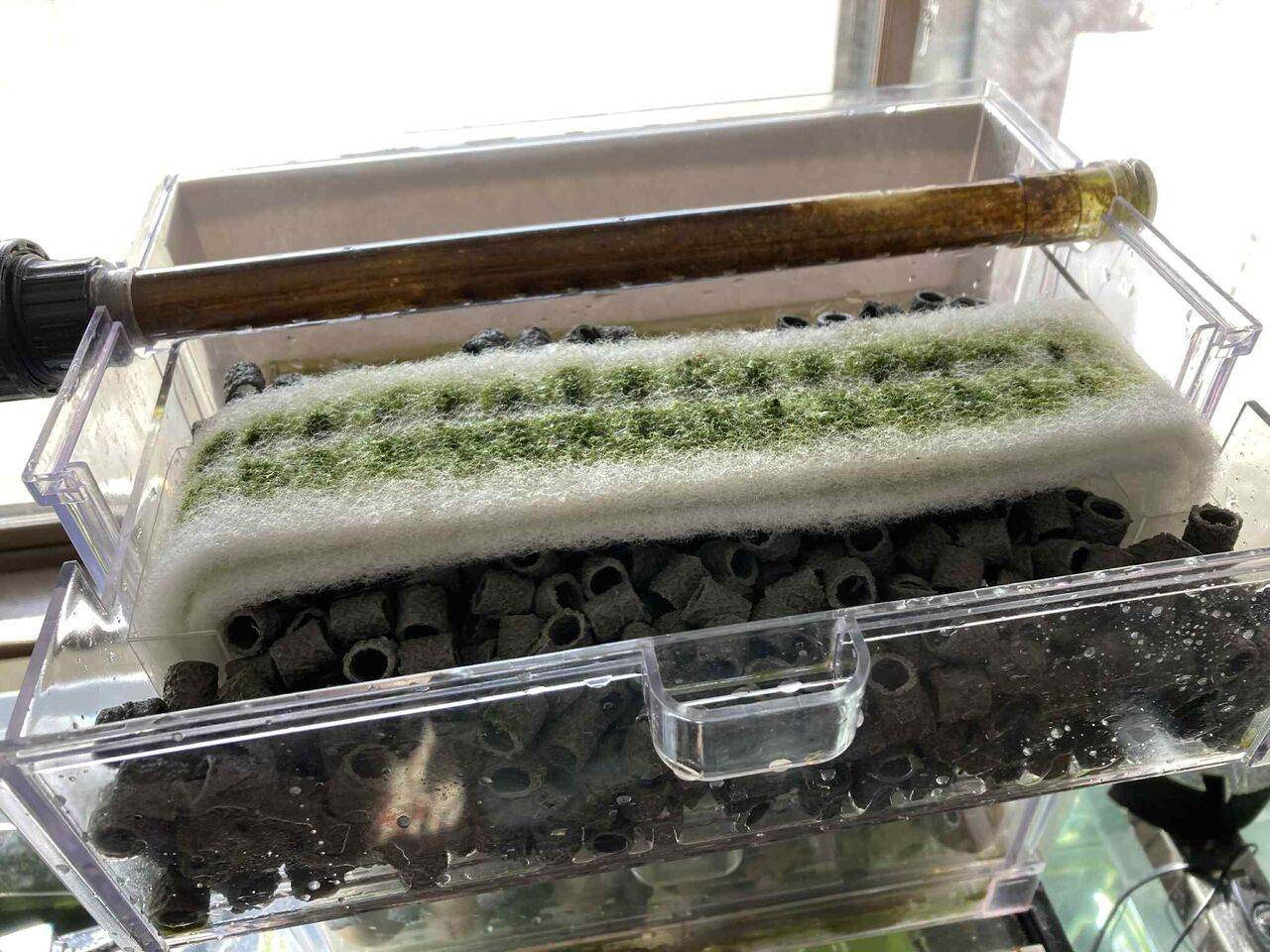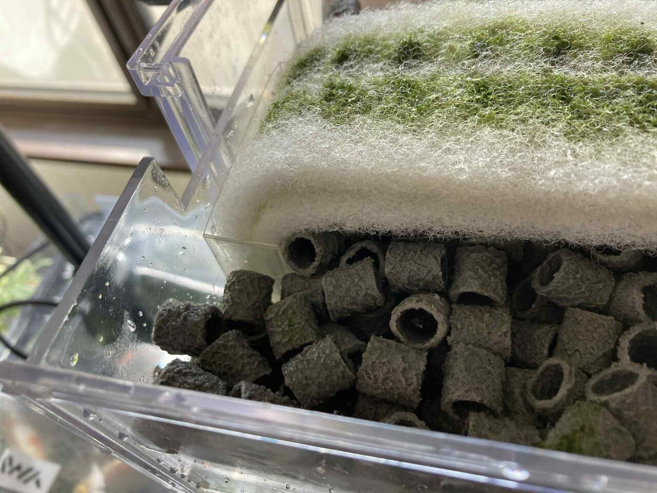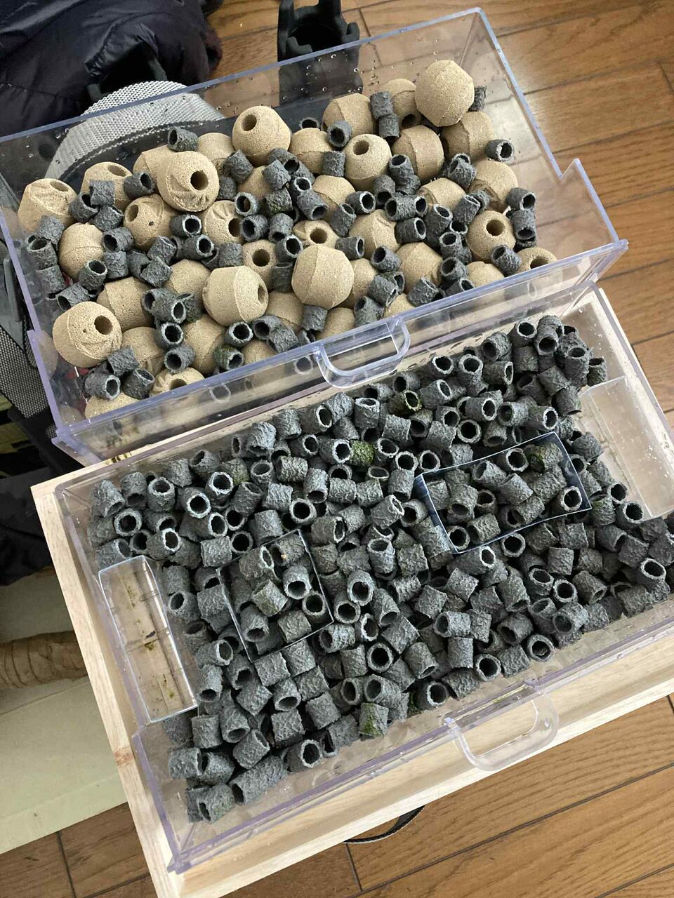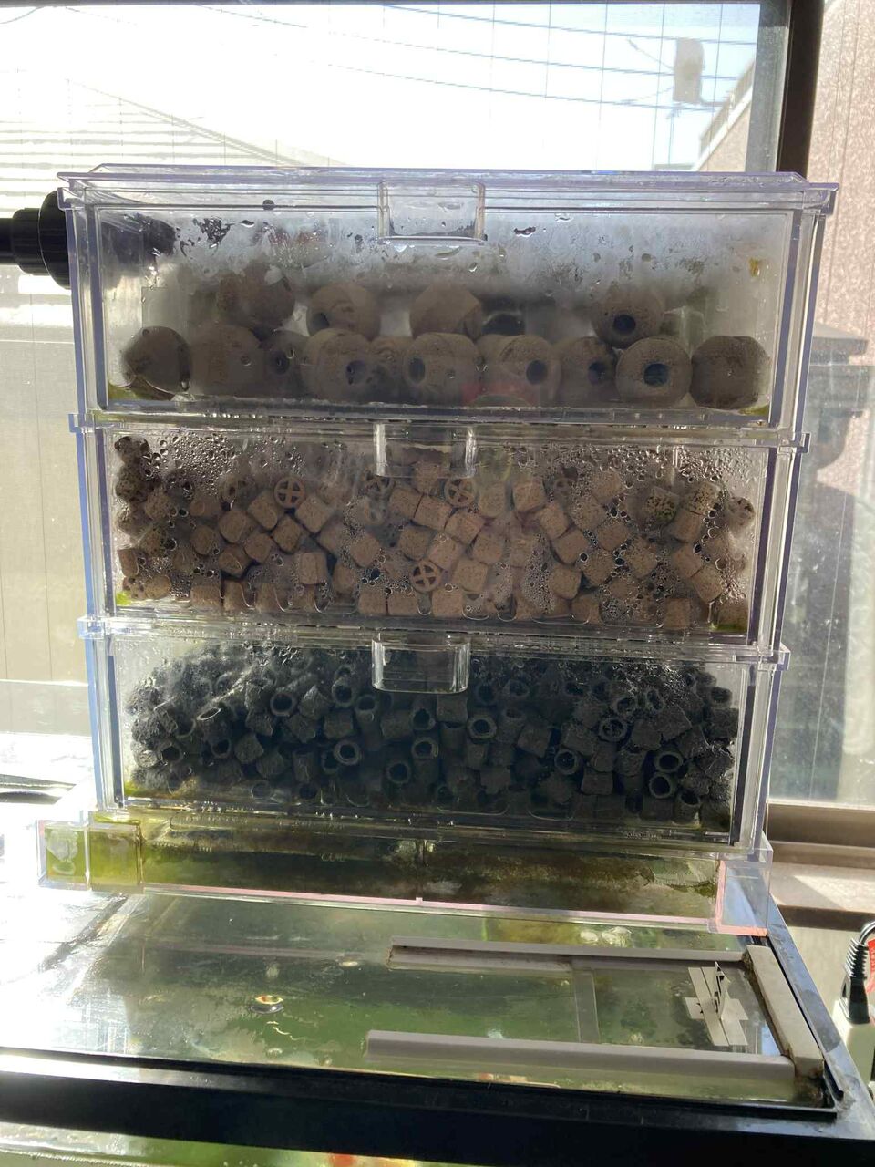 キンギョの水槽には3段の濾過槽があるのですが、濾材は下段から始まり中断へ、そして昨日はその全てに濾材を入れられました。