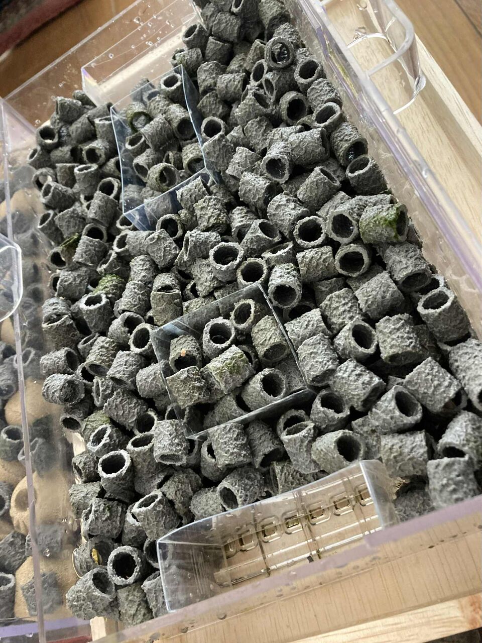 新しい濾材は水道水で洗うとカルキが付いてしまいバクテリアが死んでしまうのです。