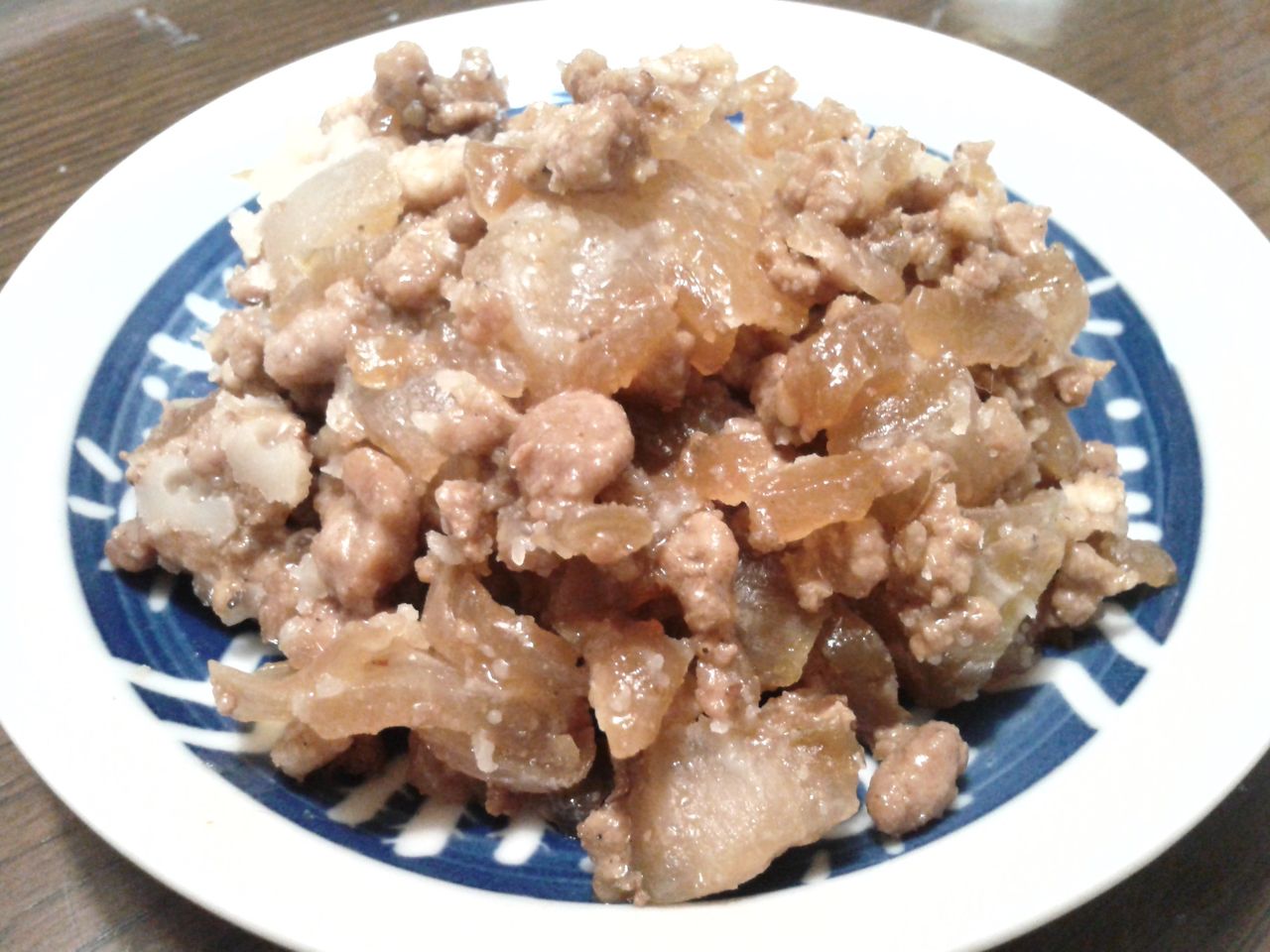 普段、粗びきのひき肉って、あまり我家の食卓でには上らないのですが、上顎と下ですりつぶすことができる、上品で柔らかな「そぼろ」とは対極な、小さいけれど、肉各々が主張し、荒く切った玉葱の噛み応えが楽しい一品となります。