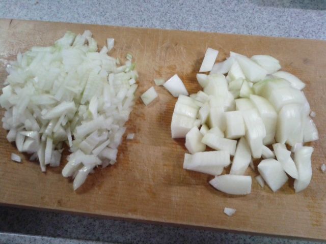 ①玉葱はそれぞれ5mm位の細かなみじん切りと、10~15mm位の、かなり荒いみじん切りにします