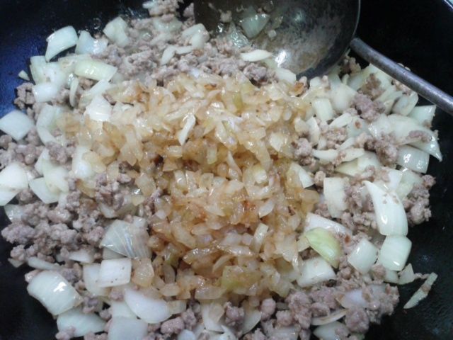 ⑥玉葱がやや透明になってきたかな? の頃合いで、先に炒めておいた玉葱を投入、更に炒めて行きます