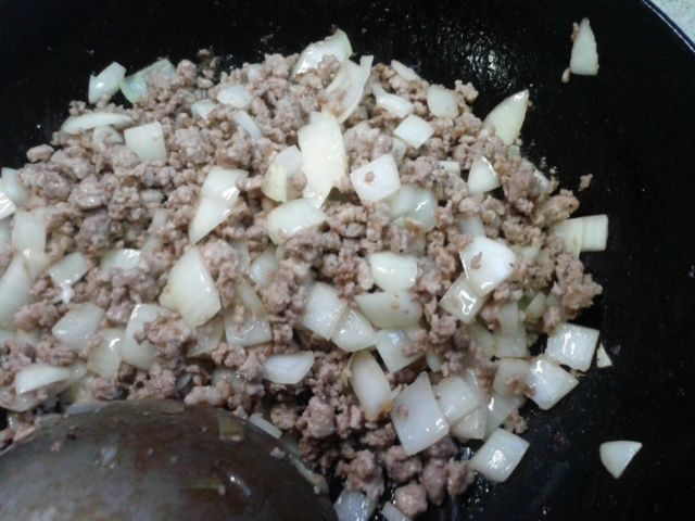 ⑤肉の表面の色がほぼ変わったころ、荒くみじん切りにしておいた玉葱と、第二の決め手、鶏がらスープの素大さじ1杯位を投入、中火で炒め続けて行きます