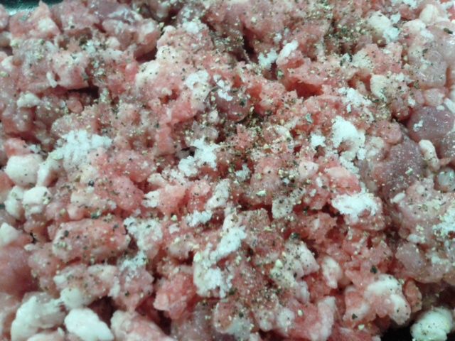 ③粗挽き肉のラップを剥がし、粗挽き胡椒と塩をします